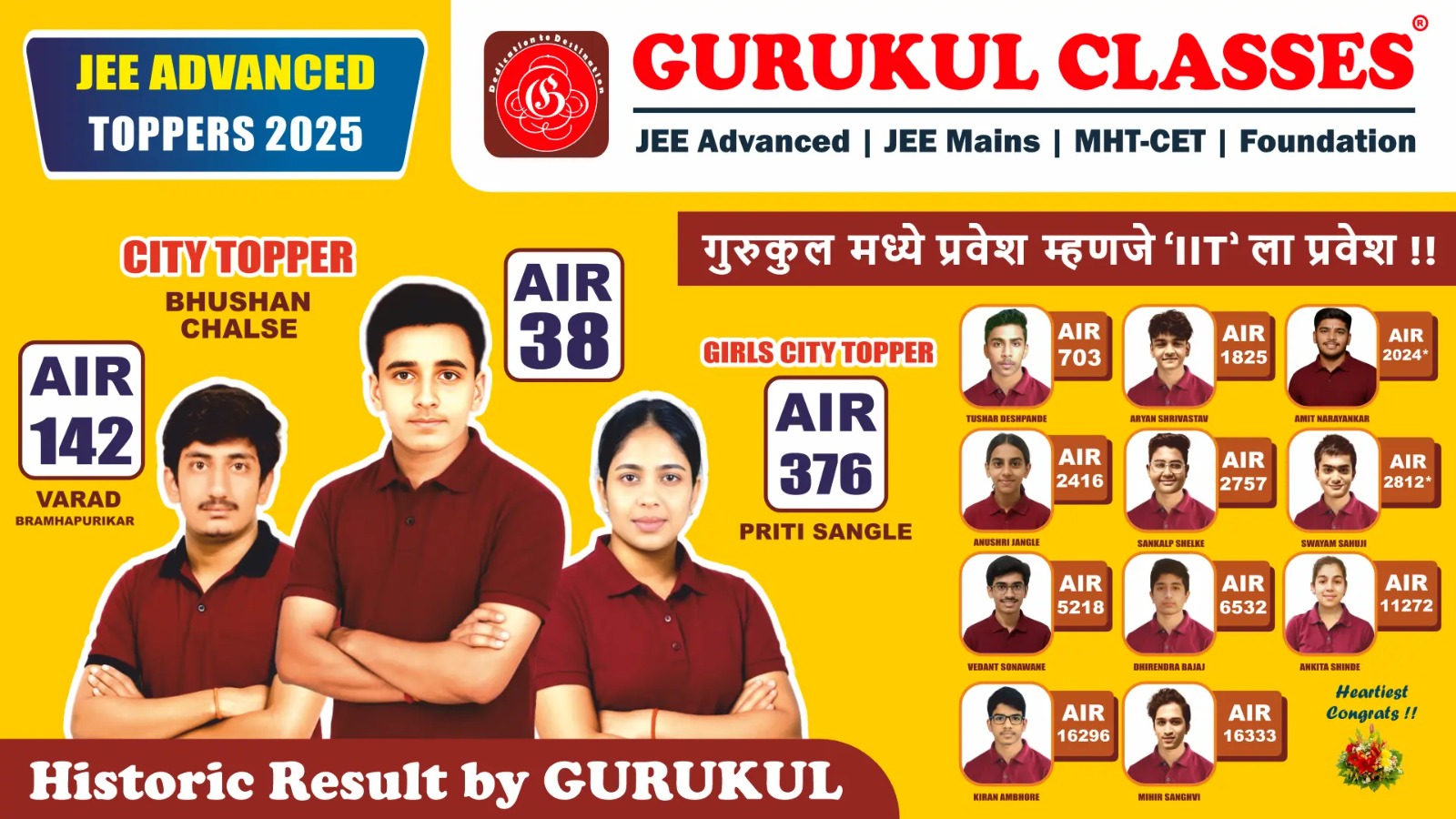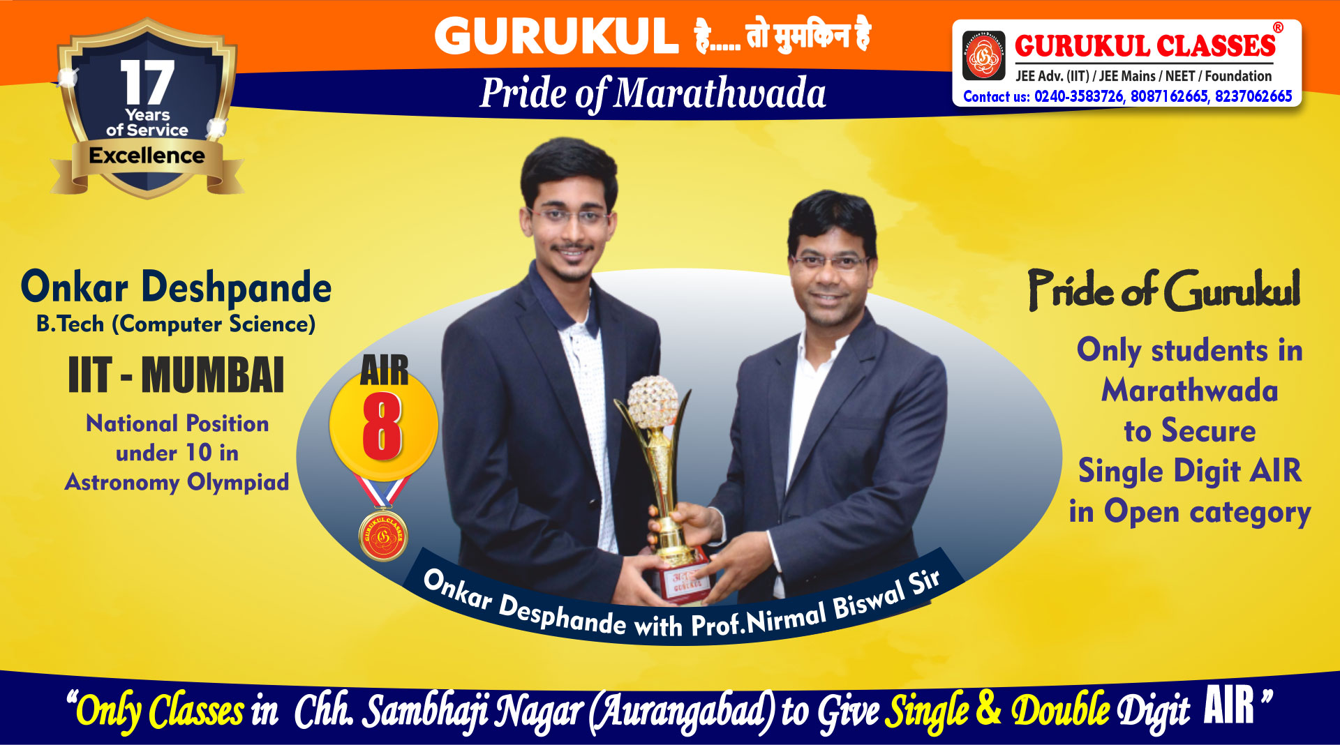 Gurukul classes is started in 2007 by Prof. Nirmal Biswal Sir in a small room with few students. Due to best results in JEE / NEET/ Foundation , Gurukul Classes became an ideal platform for students. Since 2007 Gurukul has been giving best results as well as highest selections in JEE mains, JEE Advanced, NEET, AIIMS and MHT-CET. Gurukul classes has created national reputation by producing AIR 3* by Atharva Nandapurkar, AIR-8 by Onkar Deshpande, AIR-25 in NEET by Aditi Gitre and AIR-24 in KVPY by Onkar Deshpnade.